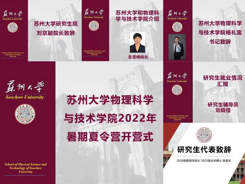开营仪式上,研究生院刘京副院长向各位营员的到来表示热烈的欢迎,并向同学们介绍了我校的发展历程及在学科特色、师资力量、教育教学、科学研究、国际化等方面的总体情况,并鼓励大家积极报考苏州大学硕士以及博士研究生。吴雪梅院长就直播 的历史沿革、科研平台、师资队伍、人才培养与教学、社会服务等做了全面介绍,并诚挚邀请同学们来直播 交流和学习。直播 2022级博士研究生陈家禾同学从生涯规划、学术科研、社会实践等方面与营员分享了心得体会。研究生辅导员刘晓佳老师对直播 2021届研究生就业和升学等方面工作做了详细汇报。最后,杨礼富书记就名城名校、党建工作等方面进行了介绍,并鼓励各位营员能够尽早确定合适的研究方向,通过和研究生导师互动,能够顺利找到心仪的导师,并祝愿本次夏令营活动圆满成功。