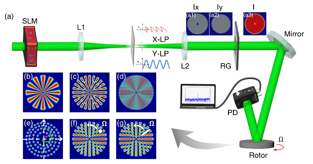 1.超密集矢量完美涡旋光束的生成示意图及旋转多普勒频移测量实验装置。