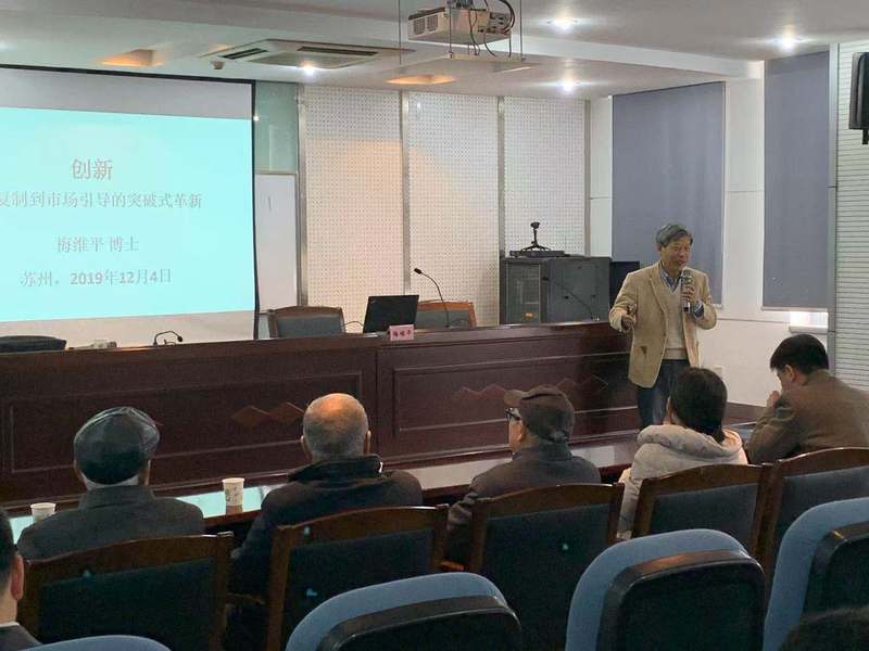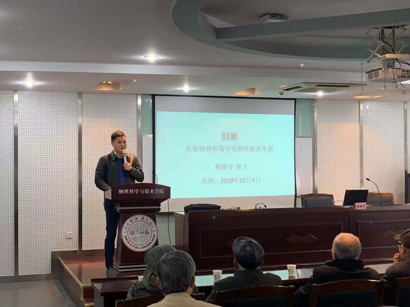 为深入贯彻“大众创业、万众创新”的国家战略要求,将创新创业精神植根于本科生职业生涯规划课程体系,进一步帮助直播 学生明确职业生涯规划,做好自我定位。12月4日下午1977级校友梅维平博士为2019级同学带来主题为“创新--从复制到市场引导的突破式革新”的报告。原苏州大学人事处处长、梅博士父亲梅国祥老师,原苏州大学物理系系主任沈永昭老师、李振亚老师,物理系退休教师吴祖嵋老师,学院孙德芬书记、方亮副院长以及2019级全体新生共同参加了本次讲座。讲座由赵承良副院长主持。